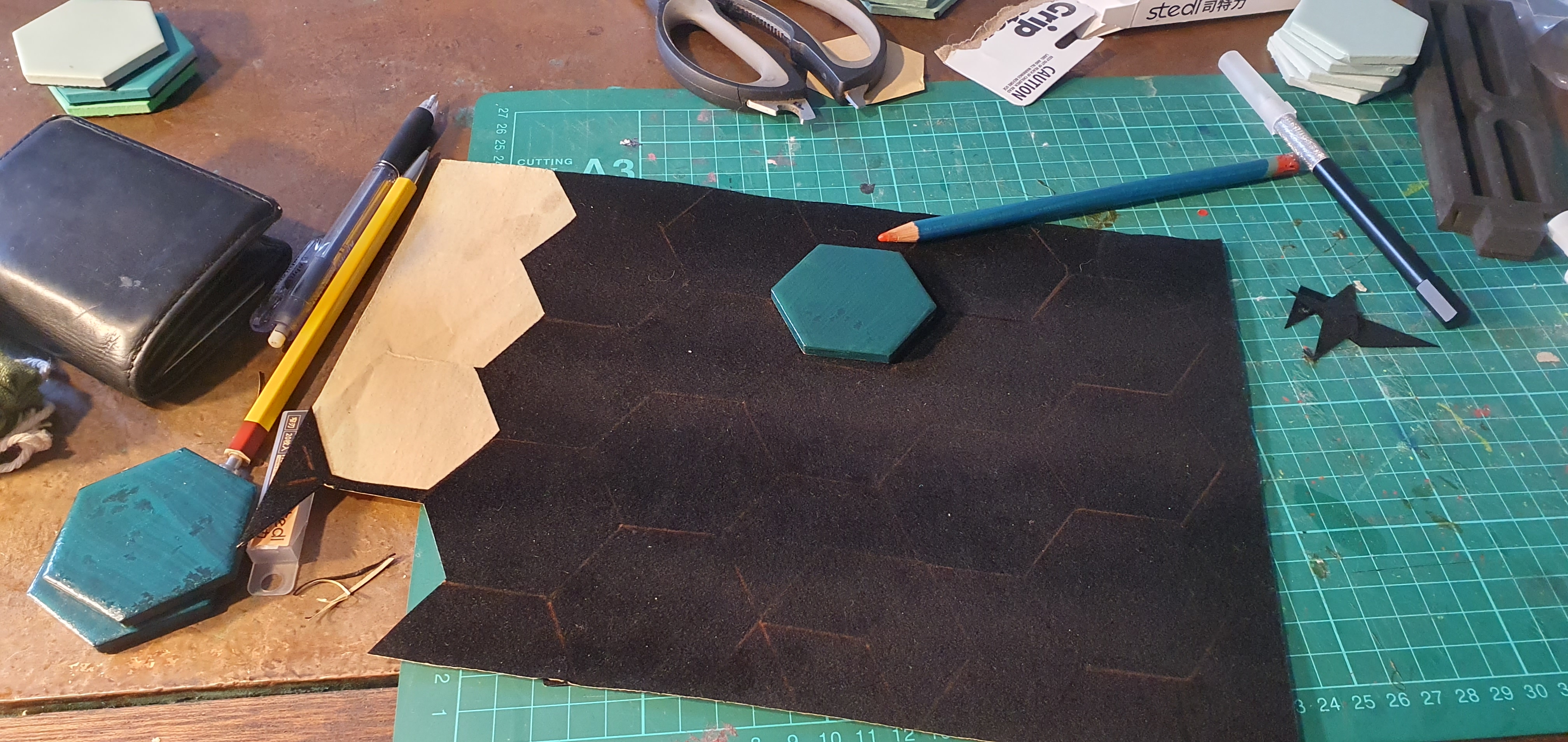 At first I thought I was onto quite the winner of just tracing out the hexagons onto the sheet, with the green felt neatly fitting 20 tiles per sheet. I traced, cut with scissors, trimmed down to exact size (as tracing around the hexagons resulted in slightly larger hexagons when cut).