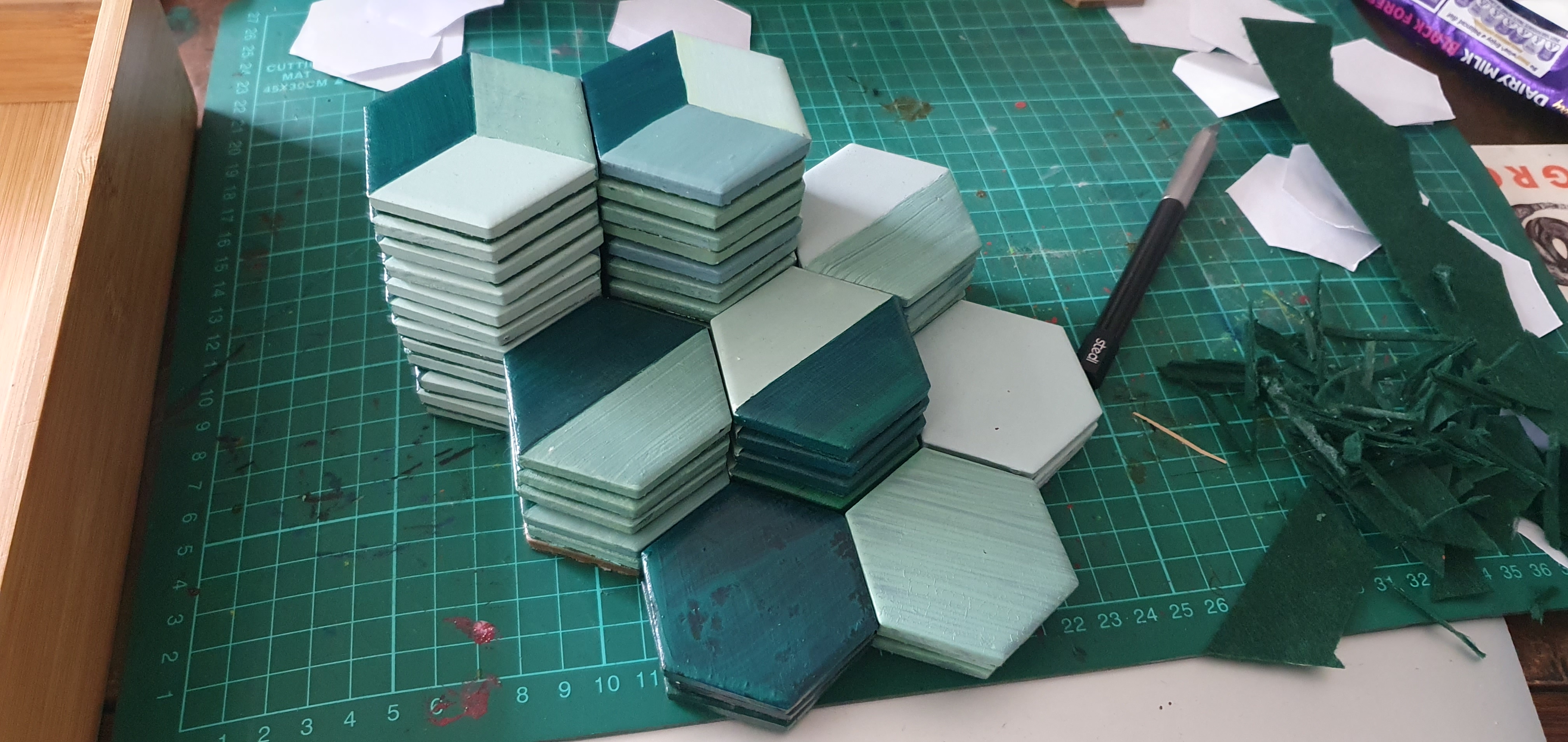 My next bulk test is to see if you can do this whilst the tiles are still on their bulk sheet. The spray and all (felt may react poorly with spray but worth a shot).